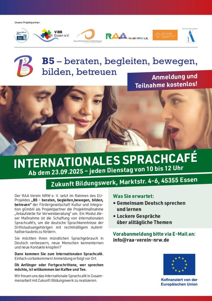 Aktuelle Projekte Aktuelles INTERNATIONALES SPRACHCAFÉ Flyer_Sprachcafe_Katernberg_B5_12_2025_ks1Herunterladen Das Sprachcafe Essen-Steele wurde aufgrund mangelender Teilnehmerzahl beendet.